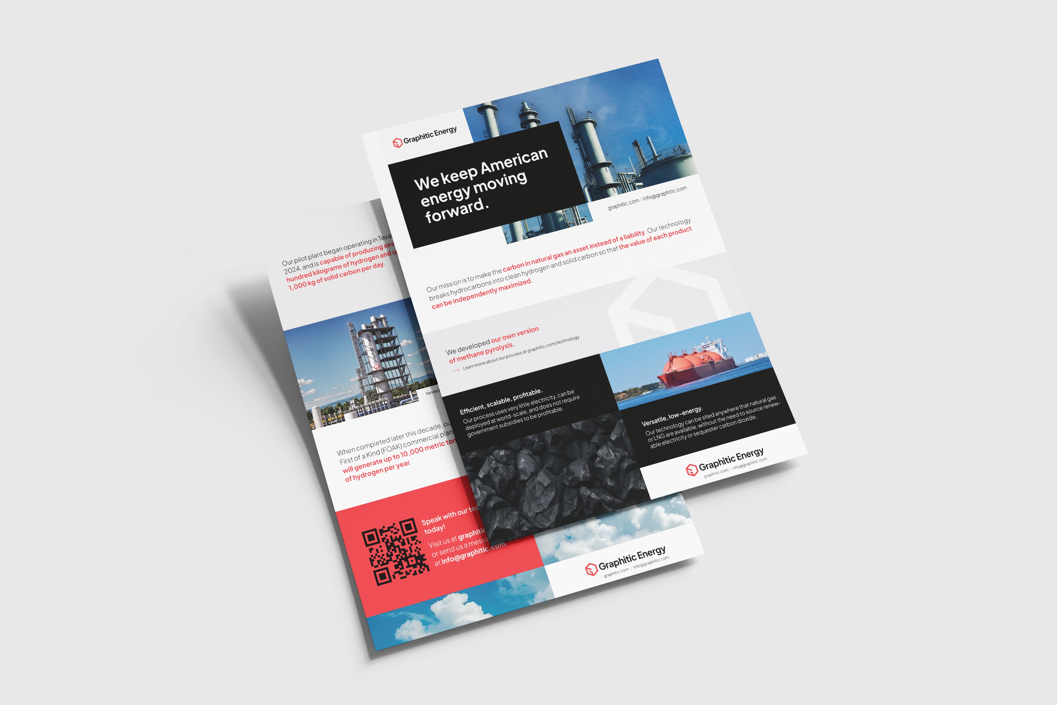New website: DG+’s website copy sought to explain Graphitic’s novel technology to a broad audience while ensuring it could also elevate Graphitic’s standing in the industry and inspire future investment. Graphitic welcomed Ryan’s unique web design ideas, which were brought to life by Nadia Johnson, the project’s lead developer. The immersive scrollytelling feature on Graphitic's "Technology" page explains Graphitic's process for converting natural gas into low-emission hydrogen and graphitic carbon using evocative imagery and dramatic spacing, creating an emotionally resonant experience that highlights Graphitic's unique capabilities and position in the market.